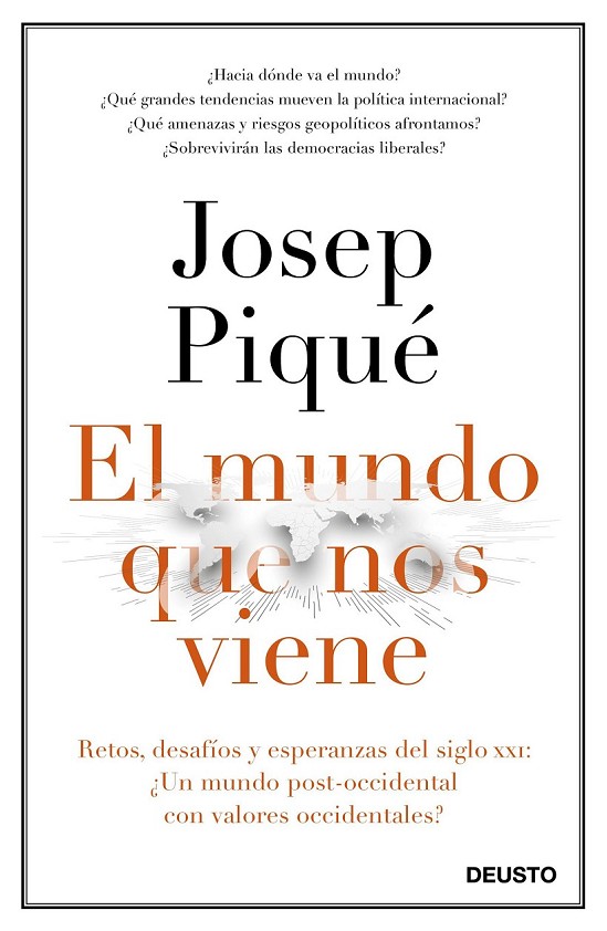 ¿Qué cabe esperar de este escenario frágil y cambiante? En estas páginas el exministro de Asuntos Exteriores Josep Piqué glosa el estado de la geopolítica global y de los riesgos y amenazas que afrontamos. En él defiende lo que denomina la síntesis neo-occidental: el mundo no viraría hacia la clásica sustitución conflictiva de una potencia decadente por otra emergente, sino hacia un nuevo orden en el que la pujanza económica y la demográfica oriental coexistirían con los actuales valores occidentales.