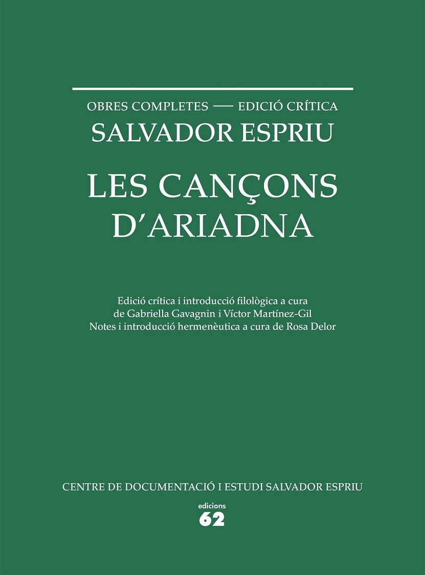 Les cançons d'Ariadna, aparegudes per primera vegada el 1949 i ampliades successivament pel seu autor, són un dels llibres capitals en la producció poètica de Salvador Espriu, i contenen uns quants dels seus poemes més coneguts. Fins ara, però, no n'hi havia cap edició que n'establís el text amb rigor filològic i estudiés la història de cadascun dels poemes i del conjunt del llibre. Tampoc no hi havia cap edició en què els poemes fossin minuciosament comentats vers a vers. Això és el que fa, finalment, aquest volum de la col•lecció Obres Completes - Edició crítica de Salvador Espriu.