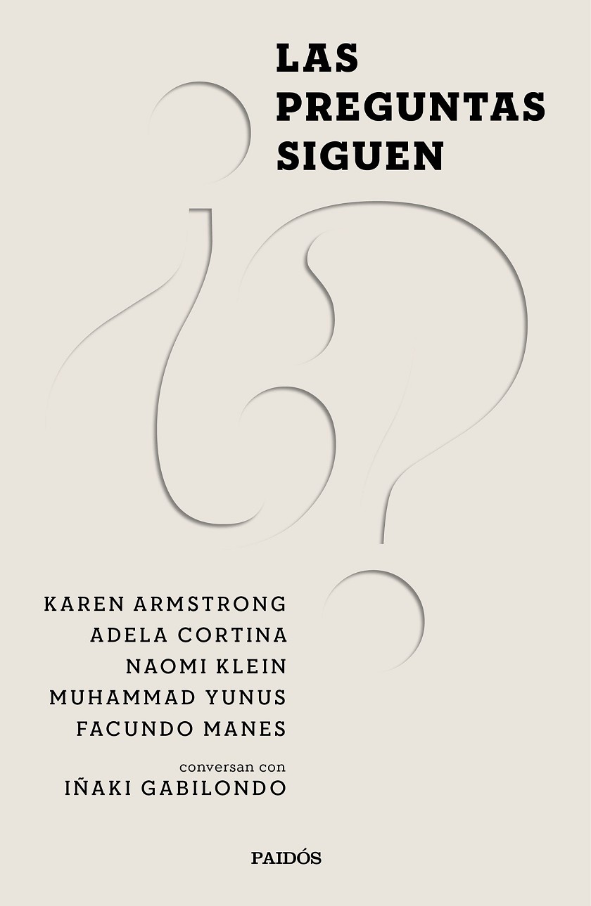 Las preguntas siguen recoge las conversaciones que el periodista Iñaki Gabilondo mantuvo con algunos de los pensadores más relevantes del momento (Naomi Klein, Karen Armstrong, Muhammad Yunus, Adela Cortina y Facundo Manes) con motivo del 75.º aniversario de Paidós en el marco del Hay Festival Digital Arequipa 2020.